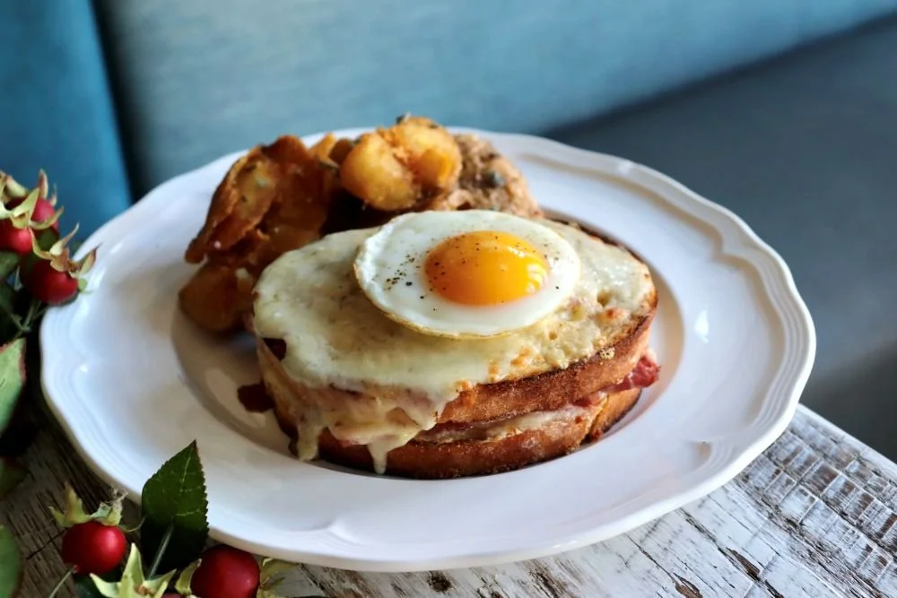 Apple Wood Smoked Ham, Gruyere, Mornay Sauce, Fried Egg, Texas Toast, Breakfast Potatoes.