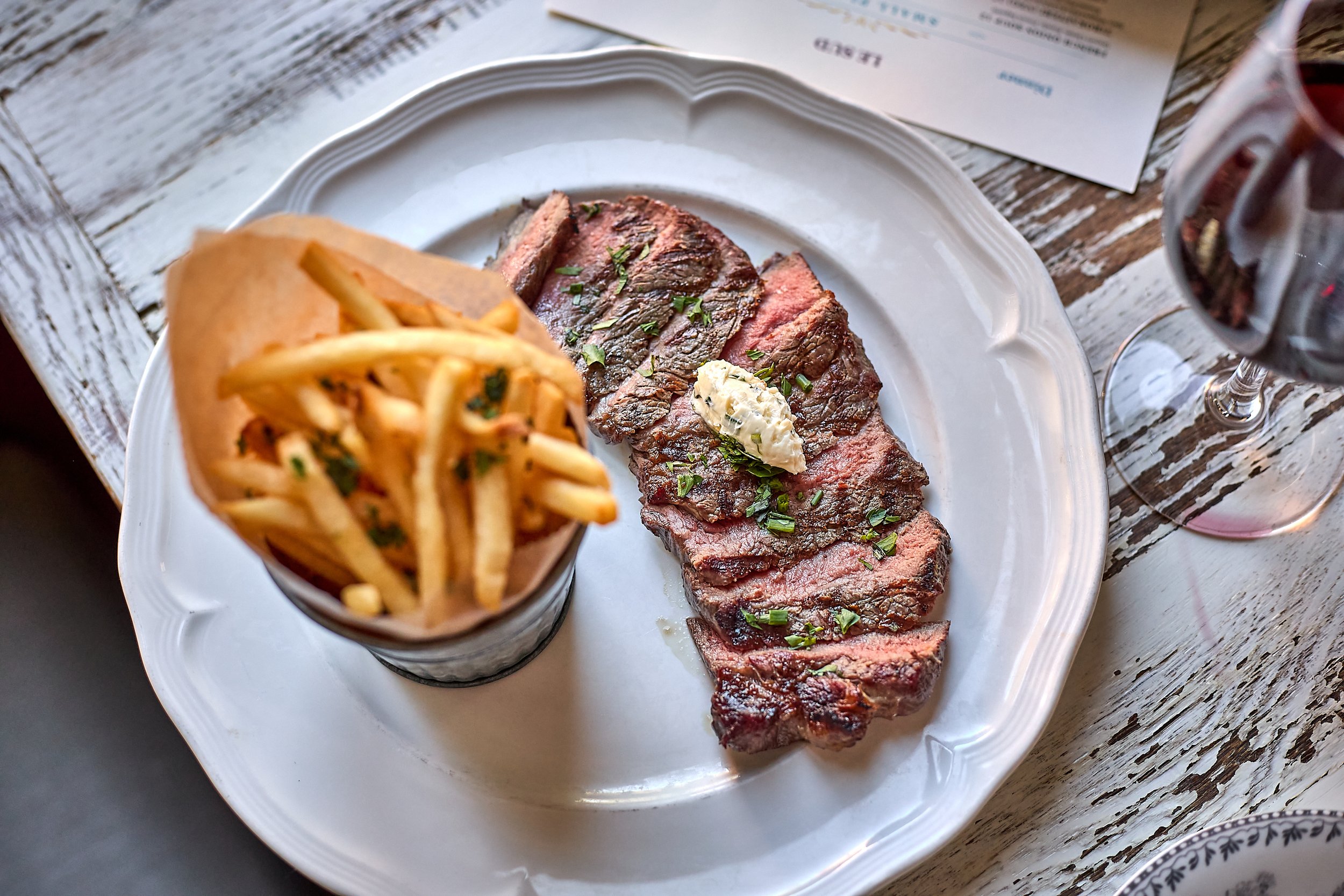 Wood-Grilled steak Maitre d’ Butter, Skin On Frites, Garlic Herb Butter, Gluten Free